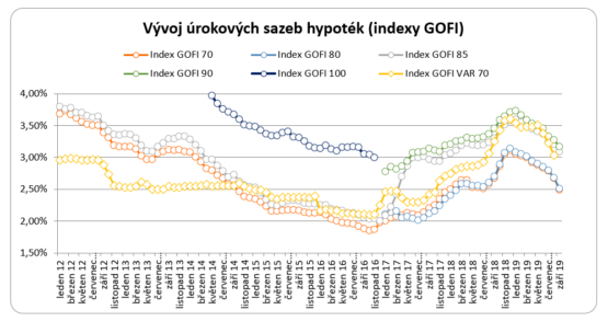 V září ještě více akceleroval pokles hypotečních sazeb. Hodnota indexu GOFI 70, který mapuje průměrnou nabídkovou sazbu hypoték pokrývajících 70 % hodnoty nemovitosti (LTV), klesla během jednoho měsíce o celých 18 bazických bodů na 2,49 % a dostala se tím pod loňskou úroveň. Hypotéky tedy zlevňují už i na meziroční bázi. Loni v září tento typ hypoték banky nabízely v průměru se sazbou 2,67 %.