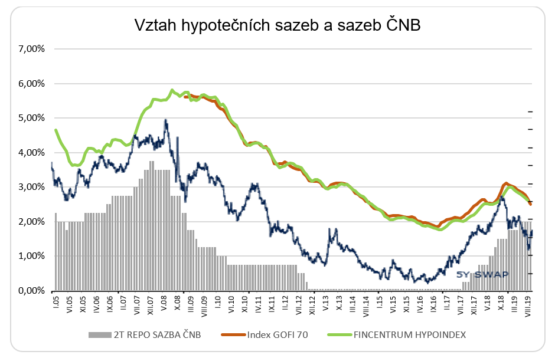 ČNB potvrdila základní sazbu na 2 procentech a deklaruje, že základní sazby by měly na této úrovni zůstat i v dalších 12 měsících. Cena peněz, které si banky opatřují na mezibankovním trhu, v srpnu dramaticky poklesla, nicméně během září se opět vrátila na „předprázdninovou“ úroveň a na této hladině se zatím drží, jak ilustruje modrá křivka v následujícím grafu. Tento graf zachycuje vztah hypotečními sazbami a cenou peněz reprezentovanou 5letým swapem a 2T REPO SAZBOU ČNB. Za pozornost bezpochyby stojí fakt, že cena 5letého swapu je již několik měsíců pod úrovni repo sazby ČNB, což se nikdy v minulosti nestalo.