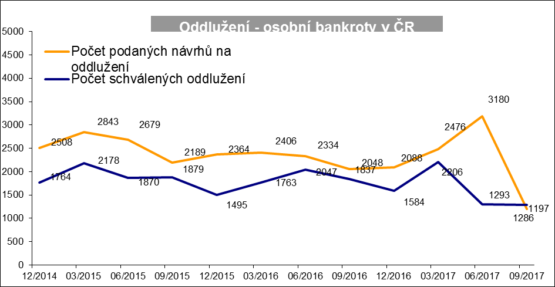Ve třech čtvrtletích roku 2017 bylo podáno celkem 16 248 insolvenčních návrhů s žádostí o oddlužení. Je to o 19,42% méně než v roce 2016. Počet návrhů na oddlužení byl v roce 2017 opět nejnižší v červenci. To bylo podáno jen 522 žádostí o oddlužení. V srpnu a září počty žádostí o oddlužení opět rostly, ale zastavili se zhruba na polovině průměrné pololetní hodnoty.
