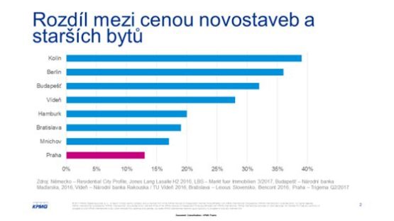 Sbližování cen za nové a starší bydlení v Praze je přitom v protikladu k tomu, jaká situace panuje v řadě jiných velkých evropských měst, jak dokládá analýza společnosti KPMG. V Praze byla ve druhém kvartále nabídková cena za nové bydlení jen o 12,7 procenta vyšší, než tomu bylo u starších bytů. V Bratislavě však byl tento rozdíl v loňském roce téměř 20procentní a Vídni 30procentní. V Berlíně pak dokonce převyšoval 35 procent. „Relativně nižší rozdíl mezi cenami novostaveb a starších bytů oproti sousedním metropolím je jedním z důsledků nedostatku nových bytů na pražském trhu,“ dodává k tomu Pavel Kliment, partner KPMG odpovědný za sektor nemovitostí.