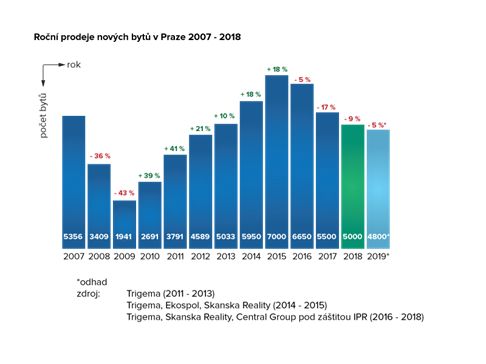 Z aktuální analýzy vyplývá, že v uplynulém roce se celkem prodalo 5000 nových bytů. Pro srovnání, v roce 2017 to bylo 5 500 jednotek a v roce 2016 se prodalo 6 650 nových bytů. Druhý kvartál byl z hlediska prodejů nejsilnější, a to s 1550 prodanými byty. Nejslabší období z hlediska prodejů bylo ve třetím kvartálu, během něhož se prodalo 1050 jednotek. Nejvíce bytů se prodalo v Praze 5 (23%), dále v Praze 9 (20%) a Praze 10 (17%). Nejméně bytů se za celý rok prodalo v Praze 6, a to pouze 2% z celkového prodeje.