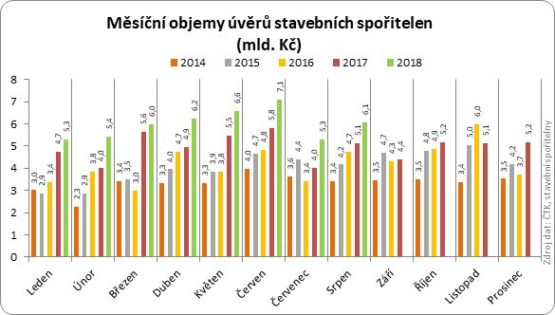 Stavební spořitelny těží jednak z toho, že hypotéky zdražují rychleji než úvěry stavebních spořitelen, ale i zde má samozřejmě vliv regulace ČNB. Jednak to bylo dřívější omezení hypotečních úvěrů na úrovni 80 resp. 90 % LTV a v druhé řadě se stejně jako u hypoték projevuje blížící se zpřísnění pravidel pro posuzování příjmů žadatelů a touha lidí sjednat si úvěr za stávajících podmínek. Stavebním spořitelnám se letos nadmíru daří, měsíc co měsíc překonávají letitá maxima a v součtu za celorok budou atakovat hranici 70 miliard Kč.